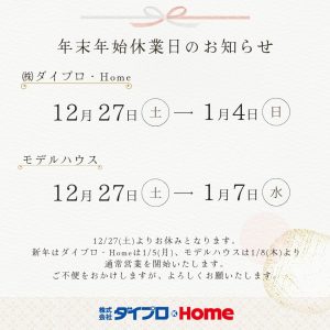 12/27(土)よりお休みとさせていただきます。 新年はダイプロ・Homeは1/5(月)、モデルハウスは1/8(木)より通常営業となります。 ご迷惑をおかけ致しますが、何卒宜しくお願い致します。 (株)ダイプロ・Hom